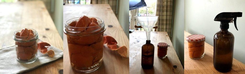 I like to make our cleaner citrus scented with old peels saved over the winter. It takes a bit longer to make as you will see but means the spay smells of oranges (or lemons) instead of vinegar and in my opinion is well worth the extra time taken.