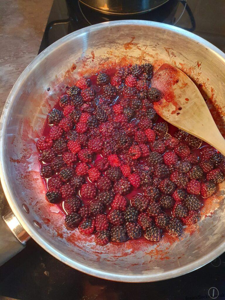 6. Once your dough has doubled in size you need to get your filling ingredients ready. In a saucepan heat up the blackberries, brown sugar, and lemon juice, and in another melt your vegan butter