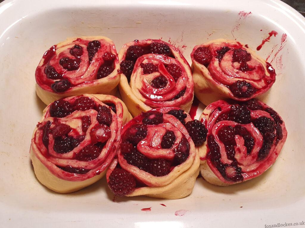 10. Cut your log into 8 rolls and place them in your dish. This bit will be wonderfully messy due to all the blackberry juice.